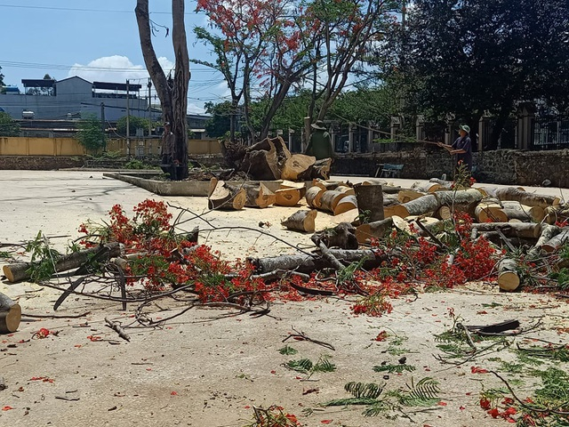 Nhiều cây phượng ở các sân trường đã bị đốn hạ, cắt thành từng khúc.