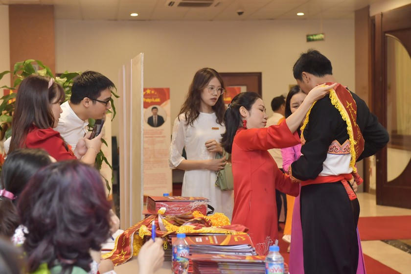 Bà Trương Thị Ngọc Ánh, Phó Chủ tịch Ủy ban Trung ương Mặt trận Tổ quốc Việt Nam, Phó Chủ tịch Hội đồng Phổ biến giáo dục Pháp luật TW và ông Nguyễn Lam, Phó Trưởng ban Dân vận TW, Uỷ viên Hội đồng Phổ biến, giáo dục pháp luật TW lên trao Cúp, Giấy chứng nhận, hoa, zuy băng cho các Gương sáng tiếp theo:
