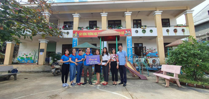 Đại diện các thành viên lớp cao cấp Lý luận Chính trị K69.B27 trao hỗ trợ 30 triệu đồng và 15 thùng sữa Vinamilk cho bà Thái Thị Kim Liên - Hiệu trưởng trường mầm non xã Minh Hóa, huyện Minh Hóa, tỉnh Quảng Bình ngày 20/10/2020.