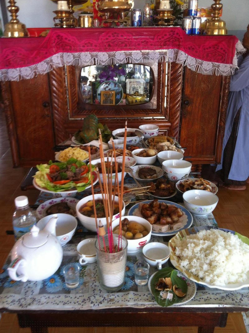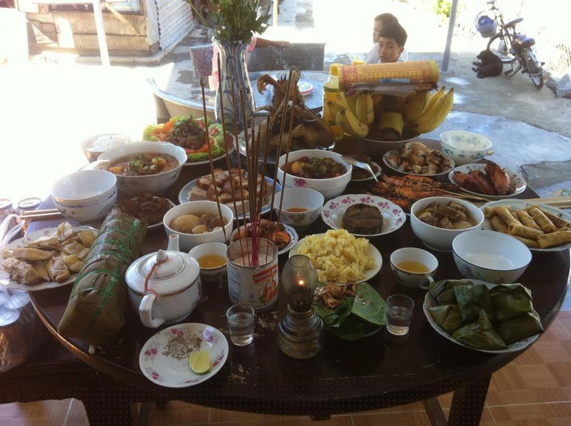 Cỗ mặn hoặc chay với đầy đủ các món ăn ngày tết, được chế biến thơm ngon tinh khiết, bày biện đầy đặn, trang nghiêm.