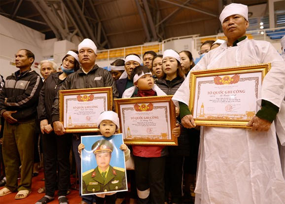 Lãnh đạo Chính phủ, đại diện các Ban, bộ, ngành, các địa phương cùng đông đảo cán bộ, chiến sĩ các đơn vị quân đội, nhân dân kính cẩn nghiêng mình trước anh linh 22 liệt sĩ.