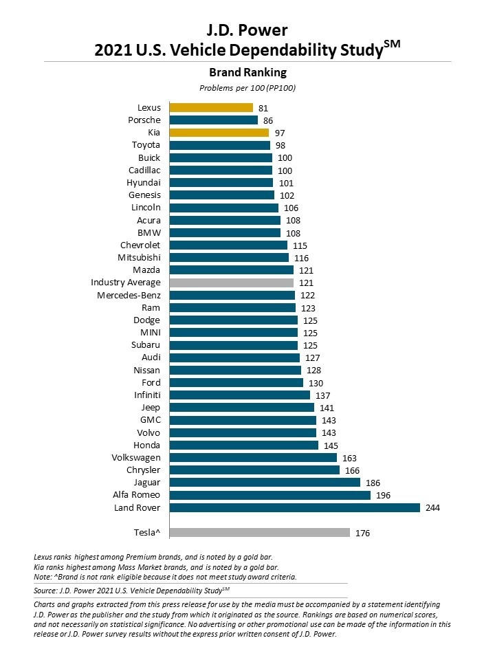 Lexus đứng đầu bảng với số điểm 81 PP100, đây là lần thứ 9 trong 10 năm hãng xe sang trọng Nhật Bản đứng đầu bảng xếp hạng. Porsche đứng ở vị trí thứ hai với 86 PP100, tiếp theo là Kia với 97 PP100, Toyota với 98 PP100 và Buick với 100 PP100. Điểm tin cậy của Kia giảm 35 PP100 so với năm 2020. Các hãng xe khác có độ tin cậy tốt hơn mức trung bình bao gồm Cadillac, Hyundai, Genesis , Lincoln, Acura, BMW, Chevrolet, Mitsubishi và Mazda.