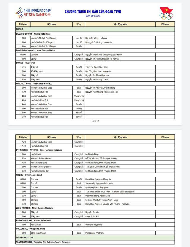 Lịch thi đấu SEA Games 30 ngày 4/12: Chờ Ánh Viên “mở hàng” HCV