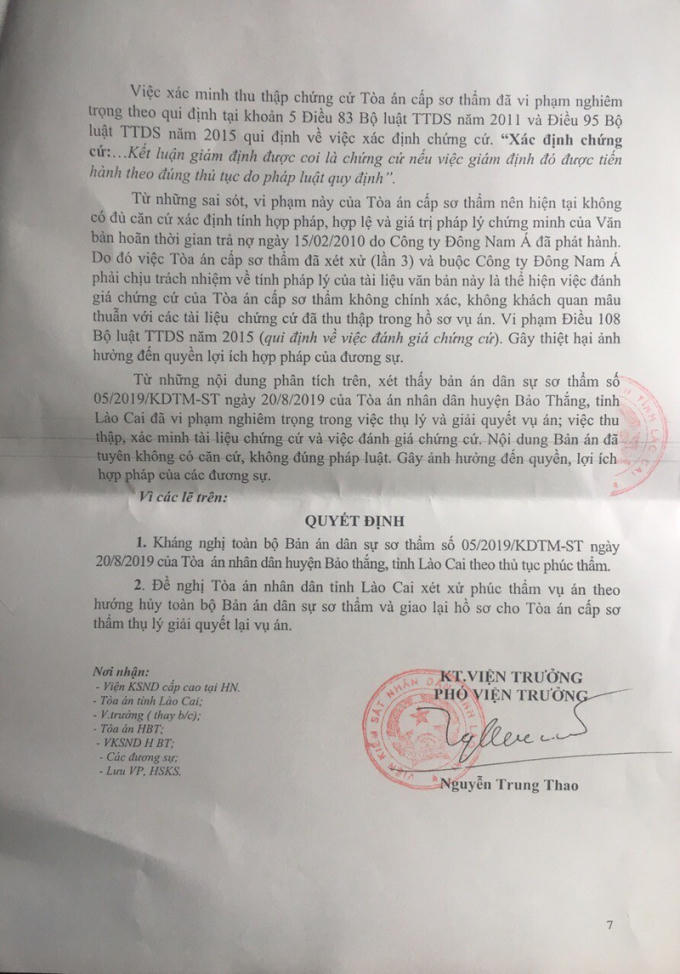 Một loạt vi phạm tố tụng như thu thập chứng cứ không đầy đủ, sai án phí, sai quy trình tố tụng… nên án bị hủy. Nhiều lần xử phúc thẩm, rồi hủy án, rồi lại sơ thẩm, thậm chí vụ kiện đã đi lên tận Tòa án Cấp cao tại Hà Nội, chỉ rõ những sai phạm tố tụng, xác định “Văn bản xin khất nợ” kia không đủ căn cứ pháp lý, nhưng tòa Bảo Thắng khi xử sơ thẩm lần 3 (tháng 8/2019) vẫn cố tình khẳng định nó có giá trị.