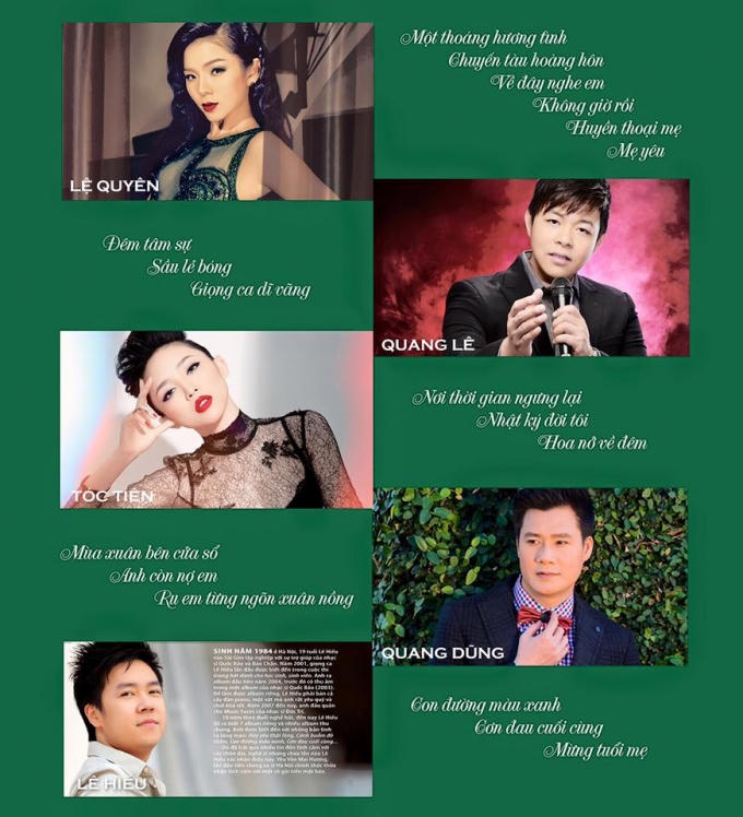 Lệ Quyên lãng mạn bên Quang Dũng, tình tứ bên Tuấn Hưng, ngọt ngào bên Quang Lê, si mê bên Quang Hiếu và cực kỳ gợi cảm bên Minh Tuyết, nóng bỏng sôi động cùng Tóc Tiên.