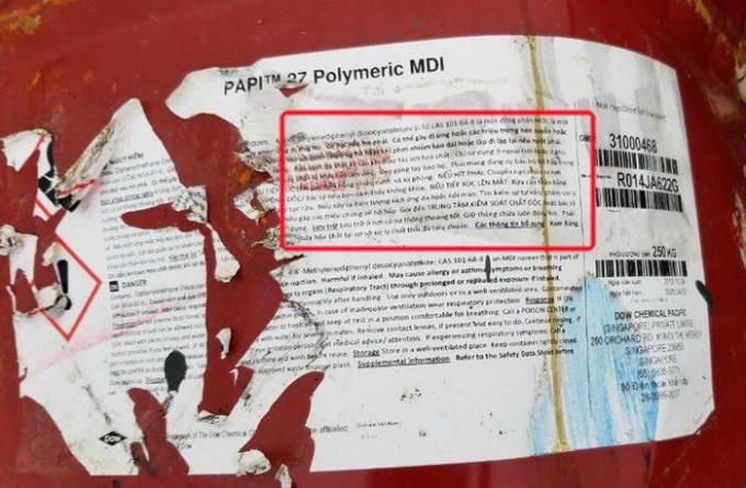 Thông tin dán trên 1 thùng phuy còn đọc được cho thấy cảnh báo có thể gây nguy hiểm.