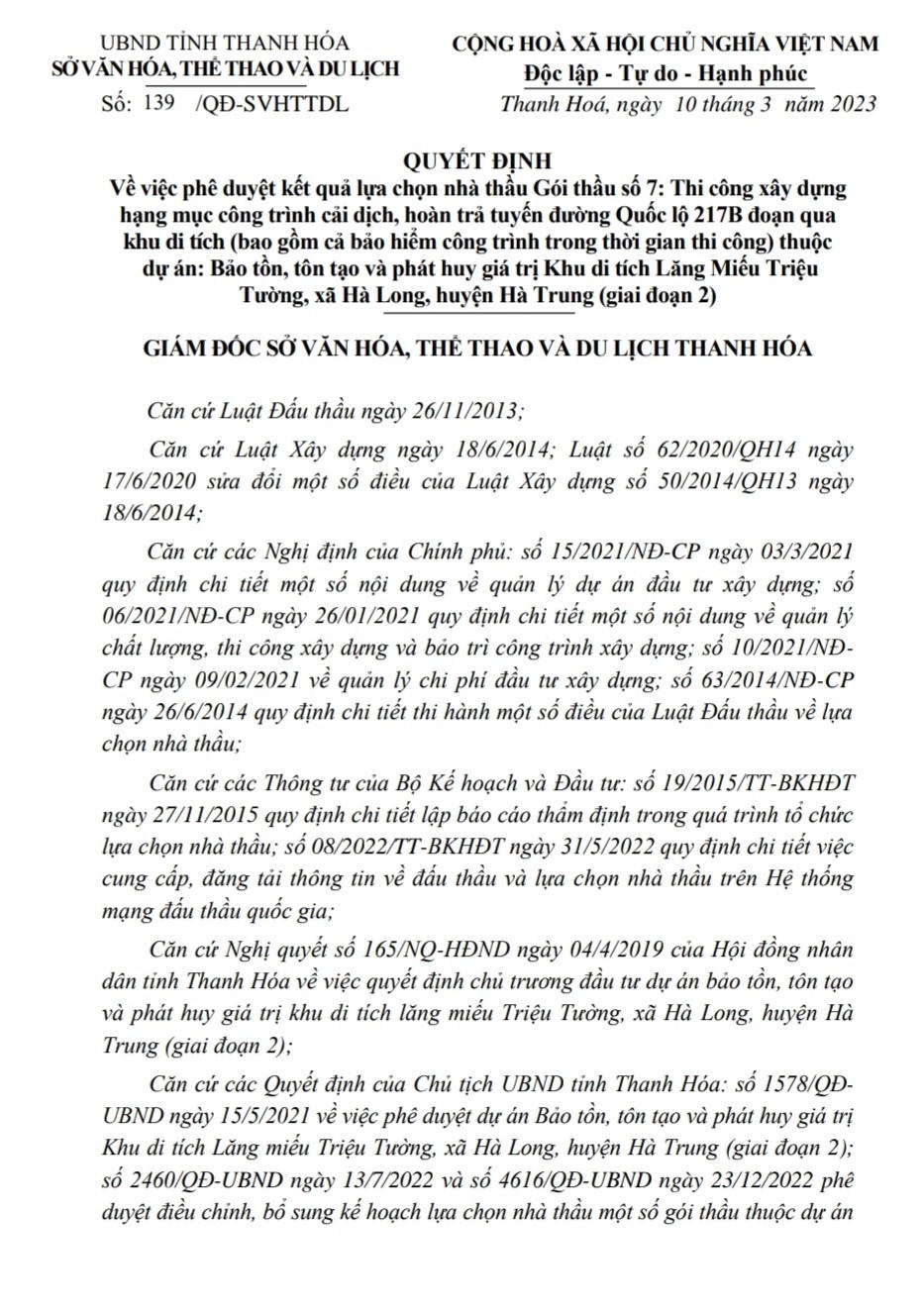 Cụ thể, ngày 10/3/2024 ông Phạm Nguyên Hồng, Giám đốc Sở VHTT&DL tỉnh Thanh Hoá đã ký Quyết định số 139/QĐ-SVHTTDL về việc phê duyệt kết quả lựa chọn nhà thầu Gói thầu số 7: Thi công xây dựng hạng mục Công trình cải dịch, hoàn trả tuyến đường Quốc lộ 217B đoạn qua khu di tích bao gồm cả bảo hiểm công trình trong thời gian thi công thuộc Dự án Bảo tồn, tôn tạo và phát huy giá trị Khu di tích Lăng Miếu Triệu Tường xã Hà Long, huyện Hà Trung giai đoạn 2 cho Công ty VH trúng thầu với giá 17.905.163.000 VND.
