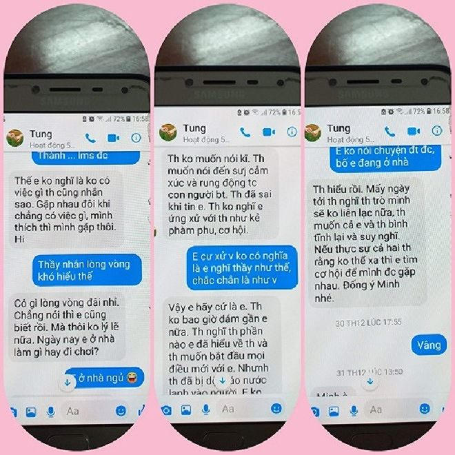 Thầy T căn dặn xóa tin nhắn nhưng nữ sinh kia không làm theo và đưa cho bạn thân đọc để rồi bị chụp lại. Sau đó, bạn của nữ sinh phát tán loạt tin nhắn này trong nhóm Facebook của lớp.