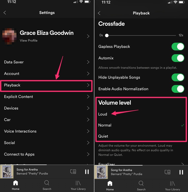 Cũng giống như các thao tác trên, nhưng nếu nghe nhạc bằng Spotify, người dùng cần truy cập vào mục cài đặt bên trong ứng dụng này. Sau đó, nhấn vào nút Playback, và chọn mức âm lượng lớn nhất (Loud) tại mục Volume level.