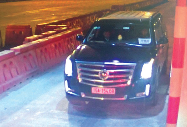 | Xe Cadillac BKS: 15A-154.68 gắn phù hiệu “xe hộ đê” qua Trạm thu phí cao tốc Hà Nội - Hải Phòng (Ảnh chụp qua màn hình camera ghi lại) |