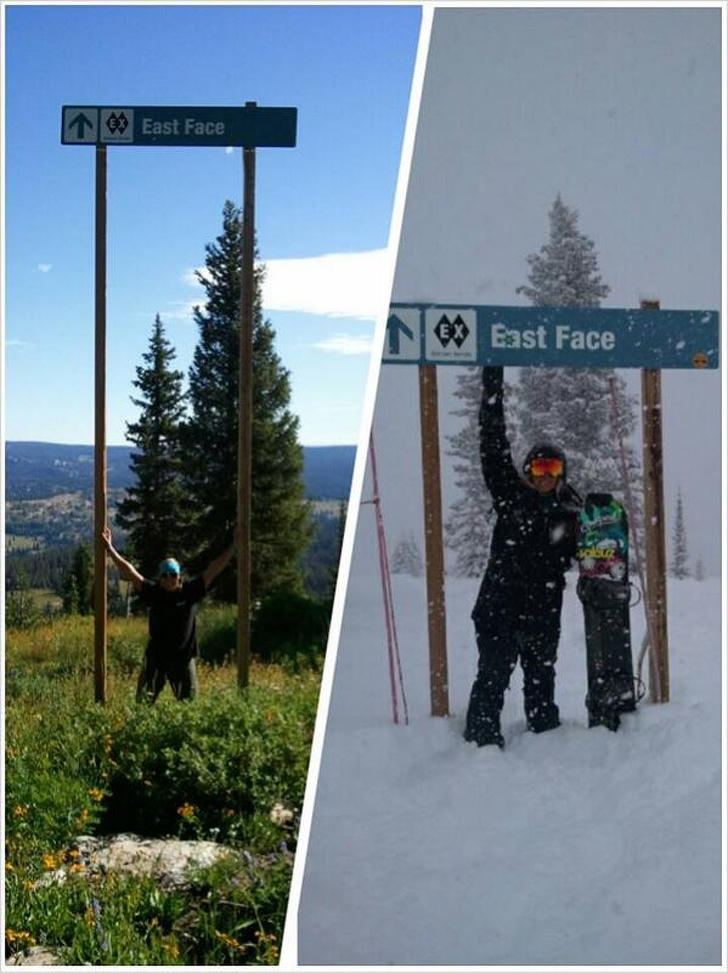 14. Biển báo tại một khu trượt tuyết vào mùa hè và mùa đông
