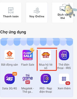 Ứng dụng "Mua hộ vé số" hiển thị trên app Ngân hàng MB. Đơn vị cung cấp dịch vụ là Công ty CP Thương mại Hợp Phong (Mã số thuế - 0109985570)