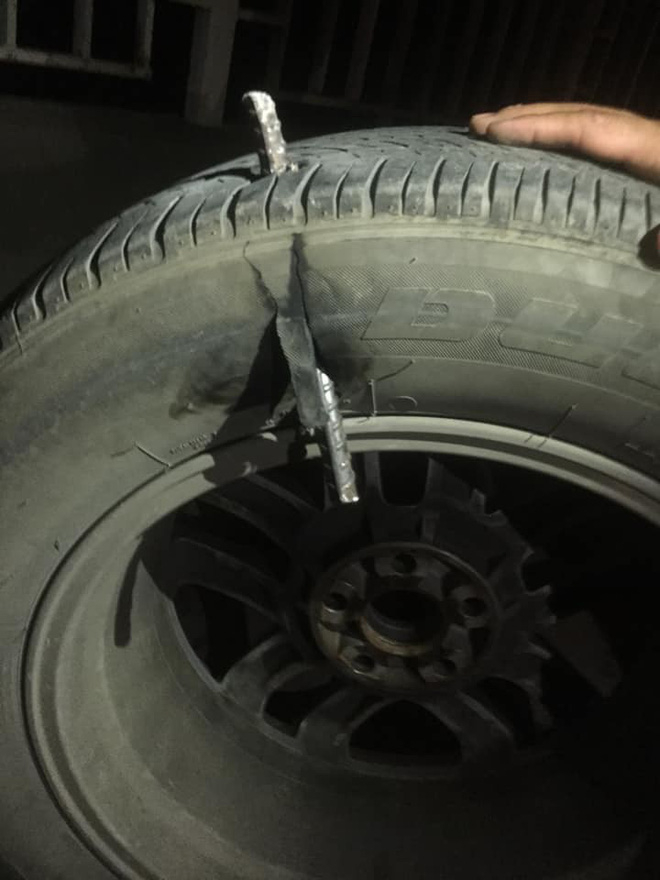 Theo chia sẻ trên trang facebook, khi đang di chuyển trên đường, xe ô tô của anh bất ngờ đi vào một cái ổ gà. Lúc ấy, trời đang nhá nhem tối. Khi xuống xe kiểm tra, Tự Long phát hiện một thanh sắt rất dài cắm xuyên vào lốp xe, hỏng một chiếc lốp.