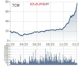 Cổ phiếu TCM tạo cơn sốt kể từ tháng 10 năm ngoái, cho đến nay đã tăng một mạch từ 20.000 đồng lên trên 80.000 đồng, tức gấp 4 lần. Thanh khoản mỗi phiên của cổ phiếu này trung bình vài trăm ngàn đến 1 triệu đơn vị.