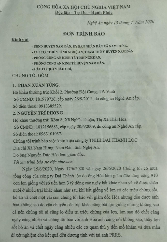 Tổng cộng trong các ngày 15, 17, 26/6 nhiều hộ dân, chủ trại đã mua 910 con giống tại công ty TNHH Đại Thành Lộc. Sau đó số lợn giống này được vận chuyển về nuôi tại các trại ở huyện Nam Đàn, huyện Tân Kỳ, huyện Nghĩa Đàn. Chỉ ít ngày sau số con giống này bắt đầu chết. Dù đã nhiều lần báo với đơn vị cung cấp con giống nhưng đại diện công ty TNHH Đại Thành Lộc lại không nhận trách nhiệm.