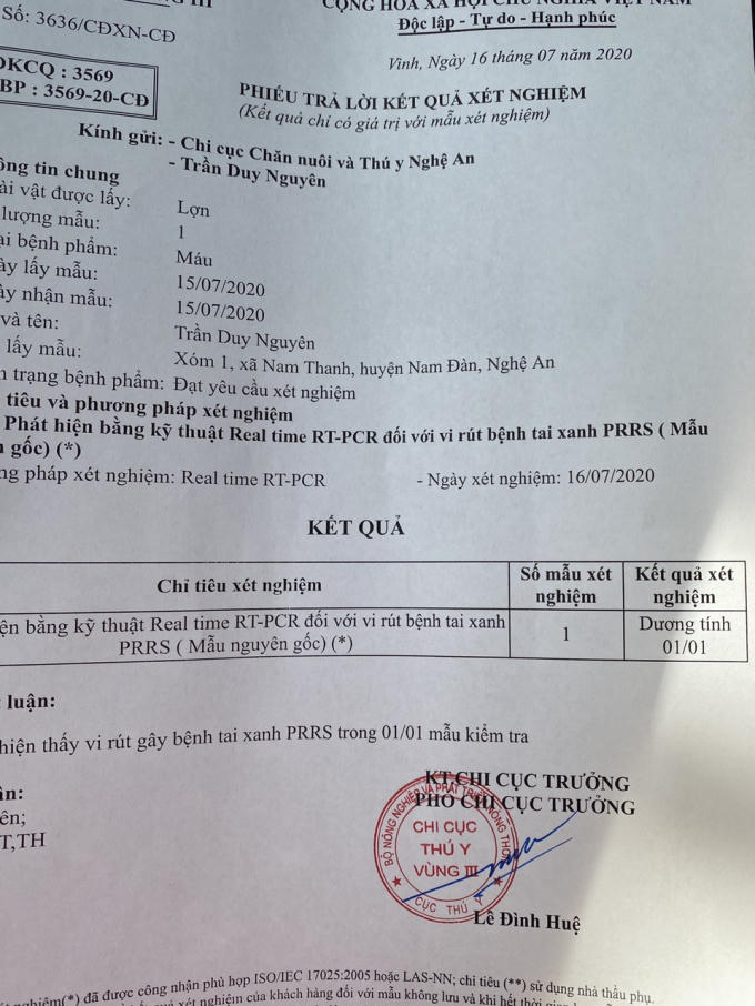 Tuy nhiên kết quả xét nghiệm sau đó lại xác định lợn chết dương tính với virus bệnh tai xanh PRRS.