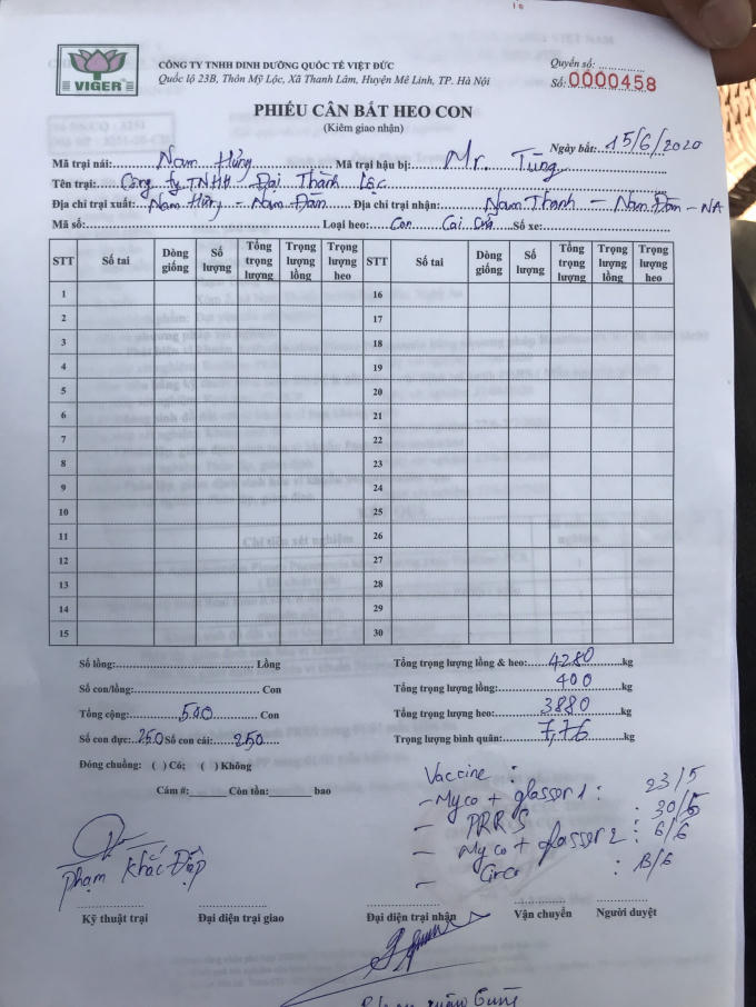 Phiếu cân bắt heo có ghi rõ từng loại vaccine đã tiêm, trong đó có ký hiệu PRRS (bệnh tai xanh PRRS).