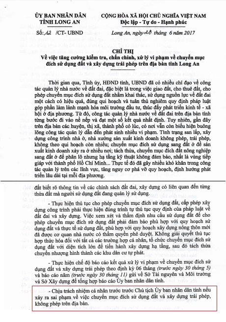 Cụ thể chỉ thị số 12/CT-UBND tỉnh Long An có nội dung nêu rõ: Chủ tịch UBND cấp huyện phải chịu trách nhiệm cá nhân trước Chủ tịch UBND tỉnh nếu xảy ra sai phạm về chuyển đổi mục đích sử dụng đất và xây dựng trái phép, không phép trên địa bàn.