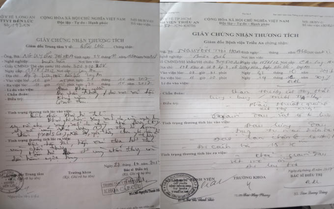 Sau khi tiến hành phẫu thuật, bà Hoa khẳng định bà cùng gia đình nhiều lần yêu cầu Công an huyện Bến Lức cho tiến hành giám định thương tích nhưng phải gần 1 tháng sau khi xuất viện, việc giám định thương tích mới được tiến hành.