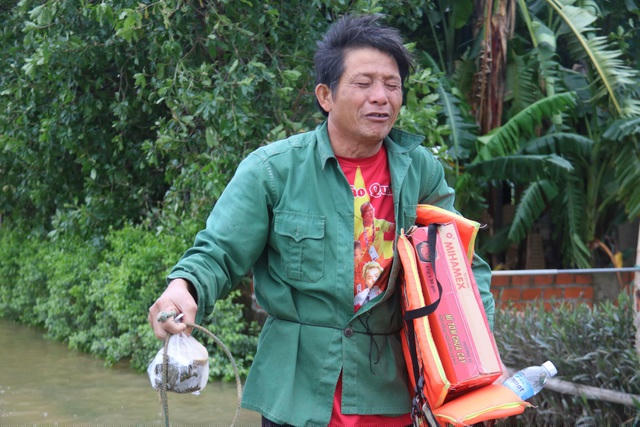 Ông Nguyễn Huy Nhung khóc khi bất lực nhìn con trâu bị cuốn trôi, trên tay ông vẫn còn cầm chiếc dây thừng buộc trâu.
