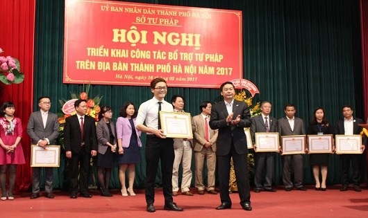 | Phó Chủ tịch UBND TP Hà Nội Lê Hồng Sơn tặng Bằng khen cho đại diện các tập thể có thành tích trong công tác bổ trợ tư pháp năm 2016. |