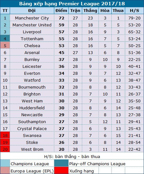 Chiến thắng trước Chelsea đưa MU trở lại vị trí thứ 2 trên bảng xếp hạng, đoàn quân của Mouriho có 59 điểm, kém đội đầu bảng 13 điểm, tuy nhiên đoàn quân của Guardiola chưa thi đấu vòng 28. Trong khi đó, thất bại khiến Chelsea tụt xuống vị trí thứ năm. Đoàn quân của Conte có 53 điểm, họ đang kém đội thứ tư Tottenham hai điểm.