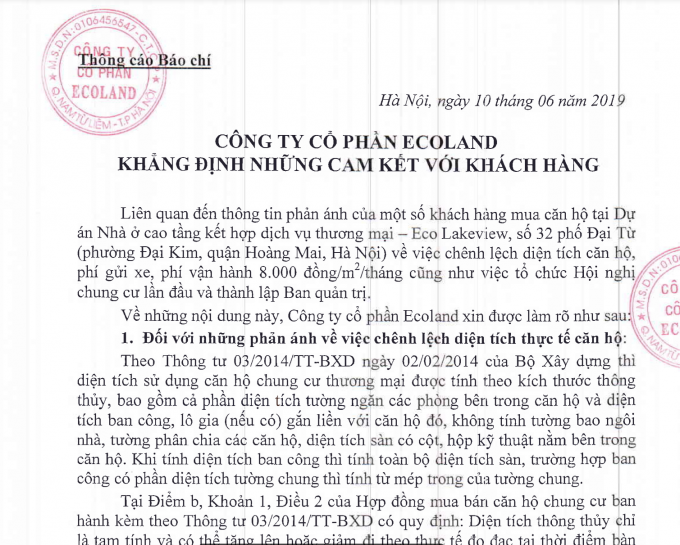 Liên quan đến những kiến nghị của cư dân Dự án Nhà ở cao tầng kết hợp thương mại Eco Lakeview số 32 Đại Từ (Đại Kim, Hoàng Mai, Hà Nội) về phí gửi xe, phí dịch vụ và chênh lệch diện tích căn hộ. Mới đây Cty CP Ecoland – chủ đầu tư dự án đã có thông tin chia sẻ với báo chí.