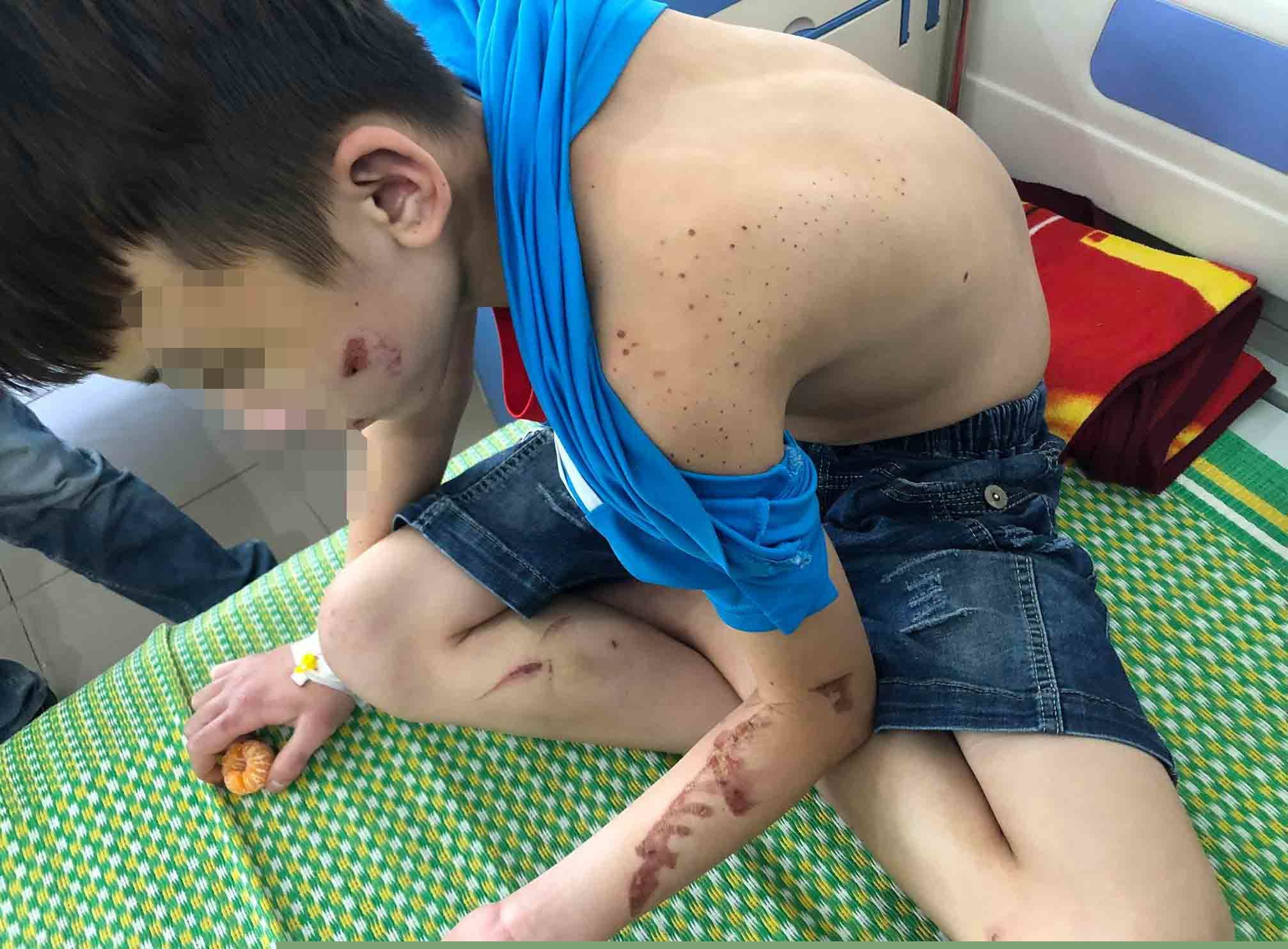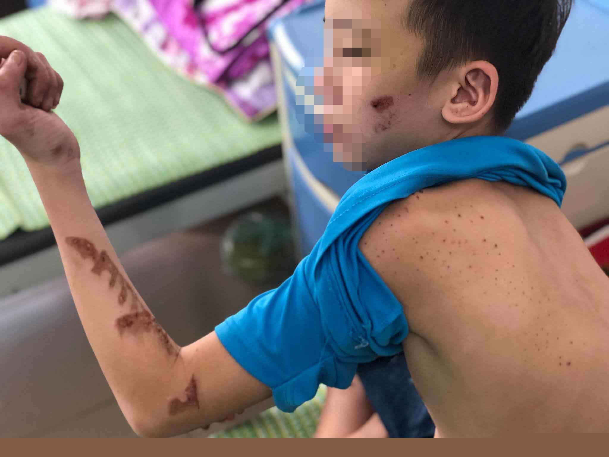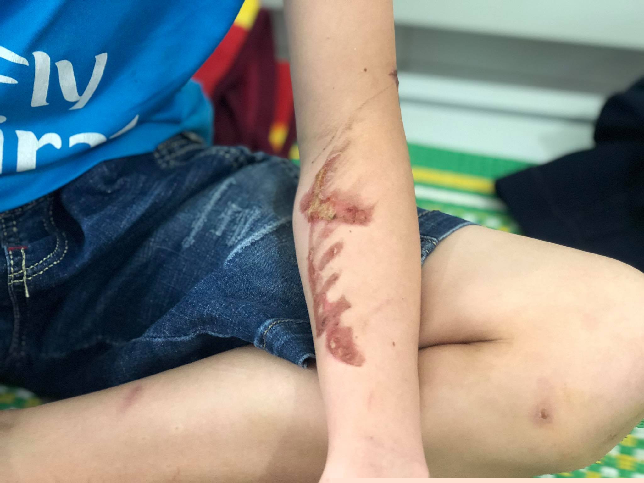 Trên mặt bệnh nhân Duy có nhiều vết bầm tím, cẳng tay có vết bỏng do que nóng. Với vết thương này, Duy sẽ phải nằm viện điều trị nhiều ngày.