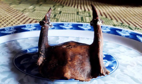 Theo lời kể của anh M, cách đây hơn nửa tháng, trong quá trình đi vào rừng tìm củi, anh vô tình phát hiện một bộ xương động vật nhỏ nằm bên gốc cây. Lại gần, thấy đôi sừng nhỏ còn dính ở vỏ não đã khô, trông khá đẹp mắt nên anh M. đã mang về nhà treo.
