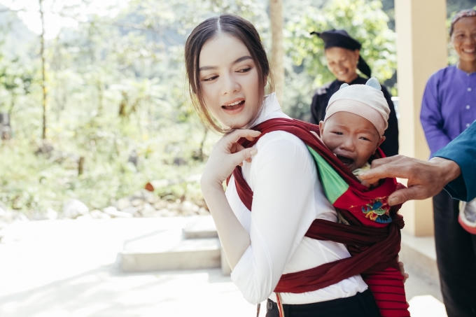 Sự thân thiện, quan tâm của Lý Nhã Kỳ giúp bà con nhanh chóng thấy gần gũi, và liên tục tấm tắc về vẻ đẹp của “cô tiên”. Bà con càng ngạc nhiên, yêu mến “cô tiên” hơn khi Lý Nhã Kỳ đã thử địu một em nhỏ đang nằm trên lưng mẹ bằng dây địu của bà con.