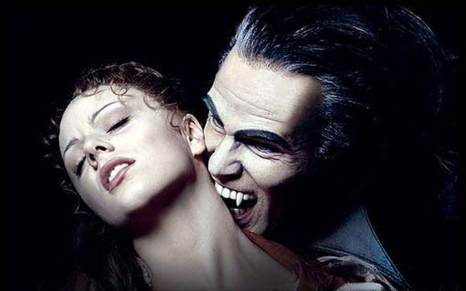 Hình ảnh ma cà rồng cắn cổ, hút máu người trong một bộ phim khoa học giả tưởng.