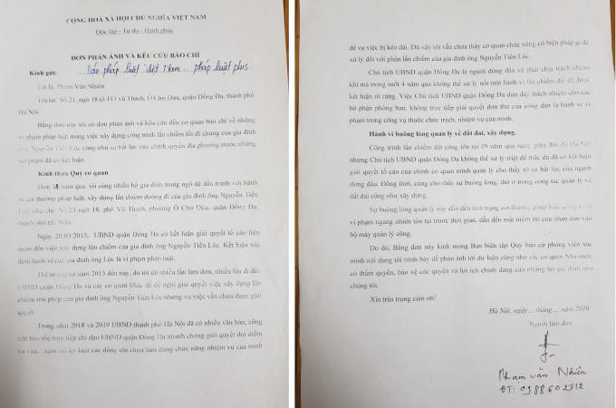 Đơn phản ánh và kêu cứu báo chí của ông Phạm Văn Nhiên