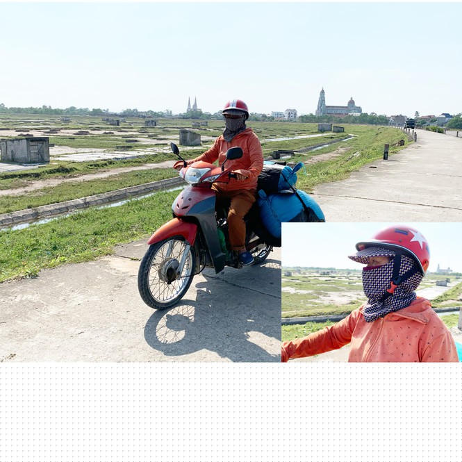 Cách nhà bà Hạnh chừng dăm bước chân, chị Trần Thị Cam (SN 1970) cũng mưu sinh bằng nghề bán muối rong. Theo nghề từ năm 16 tuổi và đến nay đã hơn 30 năm đi nghề. Ở tuổi 50 khuôn mặt chi chít những nếp nhăn, làn da đen sạm vì nắng gió và bụi đường. Đôi mắt sâu trũng hằn lên sự vất vả, cực nhọc. “Đồ nghề” của chị Cam là chiếc xe máy cà tàng. Trên xe có từ 3-4 bao tải chừng 2 tạ muối được chằng buộc chắc chắn. Ở phía giỏ xe kẹp cái cân và chai nước lớn.