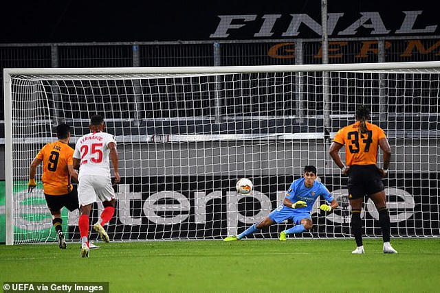 Raul Jimenez đá hỏng phạt đền khi đối mặt thủ môn Bono của Sevilla