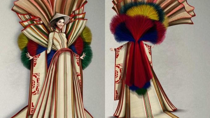 Trang phục nặng khoảng 15 kg, thiết kế theo phom dáng áo dài. Phần tay áo, quần bên trong làm từ chất liệu vải. Phía ngoài gồm những tấm chiếu bằng cói, chồng lên nhau, uốn cong. Phần tà sử dụng sải chiếu dài để thực hiện. Các họa tiết trên chiếu đính thêm cườm, tạo độ bắt sáng.