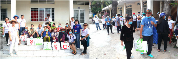 Người dân Nam Du nhận nhiều phần quà đầy yêu thương (hình trái); thậm chí, có người còn được tình nguyện viên giúp mang quà về nhà (hình phải)