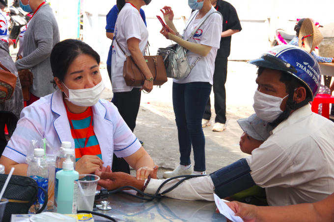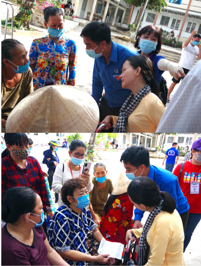 Nữ nhà văn Trần Trà My (áo bà ba) vượt gần 300 km để cùng Bí thư Tỉnh Đoàn Trần Quốc Duy (áo TNVN) đến thăm hỏi, động viên từng người dân đảo tham gia khám bệnh