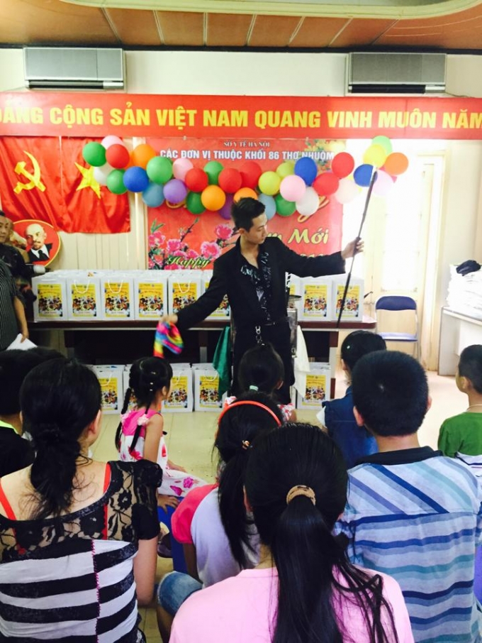 | Nghệ sĩ ảo thuật biểu diễn cho các em nhiễm H tại Quỹ hỗ trợ phòng chống HIV/AIDS. |