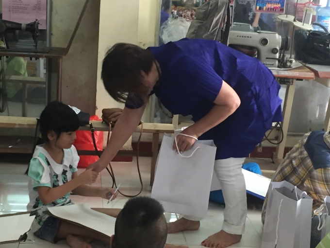 | Bà Tomi Haba trao quà cho trẻ em khuyết tật. |