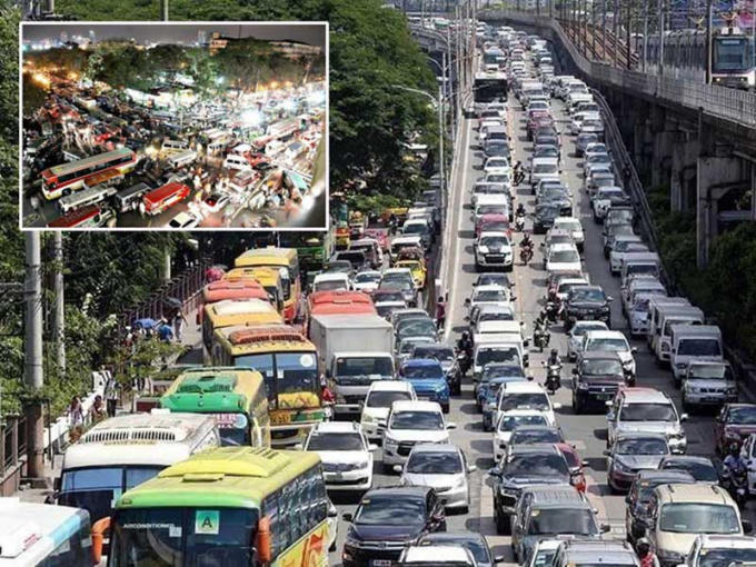 Manila kẹt xe ban ngày (ảnh lớn) lẫn ban đêm (ảnh nhỏ).