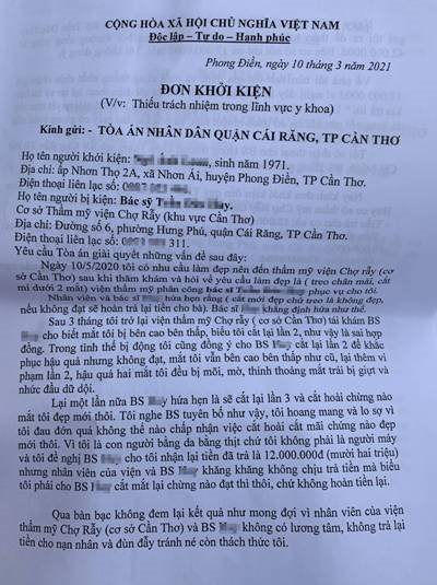 Cuối năm 2020, bà đến thẩm mỹ viện lần nữa để thỏa thuận yêu cầu bồi thường số tiền 42 triệu đồng cho những tổn thất của mình nhưng thẩm mỹ viện chỉ đồng ý trả 17 triệu đồng, bà L không đồng ý. Sau khi trở về nhà gia đình khuyên bà L chấp nhận xui rủi đồng ý nhận bồi thường 17 triệu đồng, khi liên hệ với thẩm mỹ viện bà nhận được câu trả lời “Đòi đi thưa mà, sao không đi thưa đi?”. Do quá bức xúc trước hành động của thẩm mỹ viện bà L đã gửi đơn lên Tòa án nhân dân quận Cái Răng, trước đó khoảng 2 tháng bà đã gửi đơn đến Sở Y tế Cần Thơ tuy nhiên bà L không nhận được hồi đáp nào từ Sở Y tế.