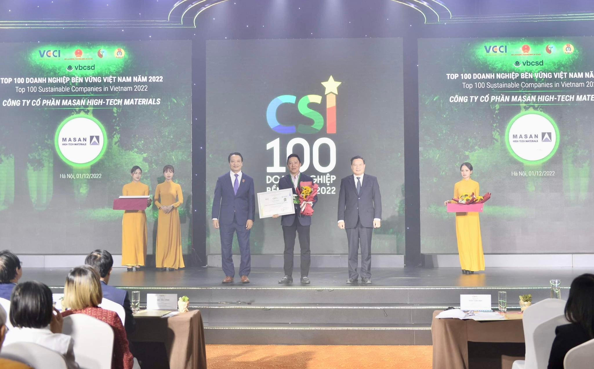 Masan High-Tech Materials đã đáp ứng đầy đủ các tiêu chí sàng lọc khắt khe dựa trên Bộ chỉ số Doanh nghiệp Bền vững (CSI) do Hội đồng doanh nghiệp vì sự phát triển bền vững Việt Nam (VBCSD) xây dựng riêng cho các doanh nghiệp Việt Nam. Là thước đo giá trị của doanh nghiệp dựa trên các tiêu chí về phát triển bền vững trong các lĩnh vực kinh tế, môi trường và xã hội, Bộ Chỉ số còn là một công cụ để đo lường và quản lý các chính sách quản trị nhằm làm cho hoạt động của doanh nghiệp được bền vững hơn. Giải thưởng CSI-100 là sự ghi nhận những nỗ lực của công ty trong suốt nhiều năm qua.