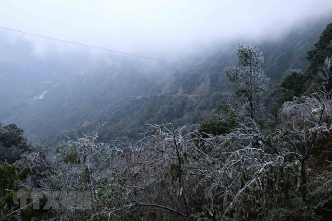 Băng giá phủ kín đoạn đèo Ô Quy Hồ thuộc địa phận tỉnh Lai Châu đi Sa Pa. (Ảnh: Nguyễn Oanh/TTXVN)