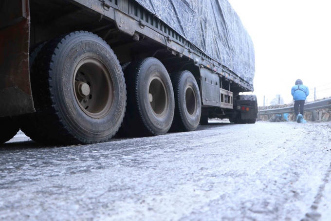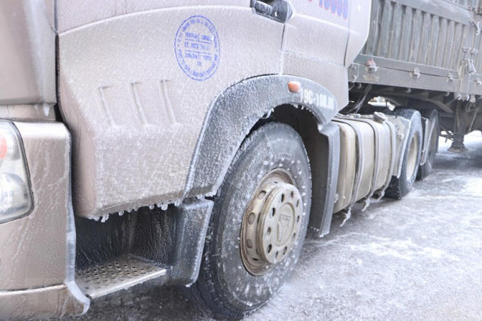 Bánh xe tải bị đóng băng. (Ảnh: Nguyễn Oanh/TTXVN)