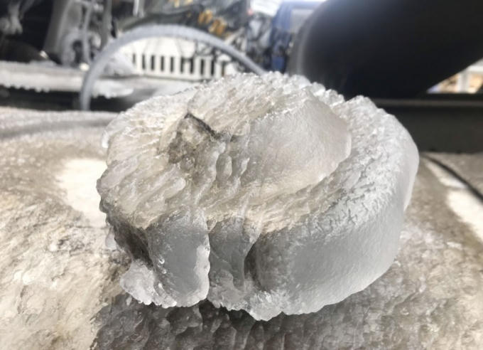 Bình xăng xe tải bị đóng băng. (Ảnh: Nguyễn Oanh/TTXVN)
