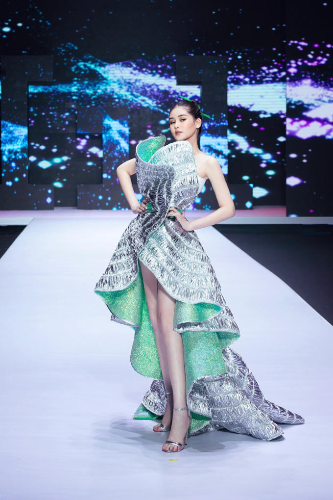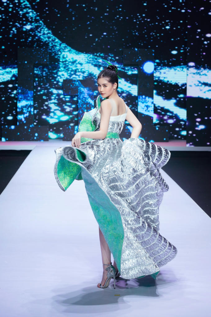 Dù có khoác lên mình các thiết kế có phần chân váy với chất liệu cứng cáp, khó di chuyển nhưng Khánh Ngọc, Suri Phương Anh vẫn sải bước tự tin, mạnh mẽ, truyền tải đúng thông điệp mà NTK Ivan Trần mong muốn.