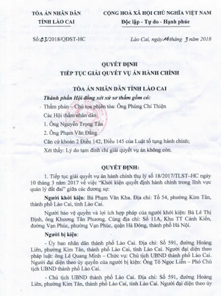 Theo đó, TAND tỉnh Lào Cai vừa ra 3 quyết định tiếp tục giải quyết vụ án hành chính thụ lý ngày 10/3/2017 về việc khởi kiện quyết định hành chính trong lĩnh vực đất đai giữa các ông bà Phạm Văn Kha, Phạm Thị Nga, Phạm Thị Nghĩa, cùng trú tại tổ 54 phường Kim Tân, TP Lào Cai với bên bị kiện là UBND TP Lào Cai, Chủ tịch UBND TP Lào Cai và Chủ tịch UBND tỉnh Lào Cai.