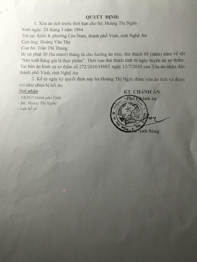 Trước đó ngày 12/7/2010 TAND TP Vinh tuyên phạt bà Hoàng Thị Ngân 30 tháng tù treo, thử thách 5 năm về tội “Sản xuất hàng giả là thực phẩm”. Ngày 12/7/2015 bà Ngân chấp hành xong thời gian thử thách, đã nạp đủ án phí.