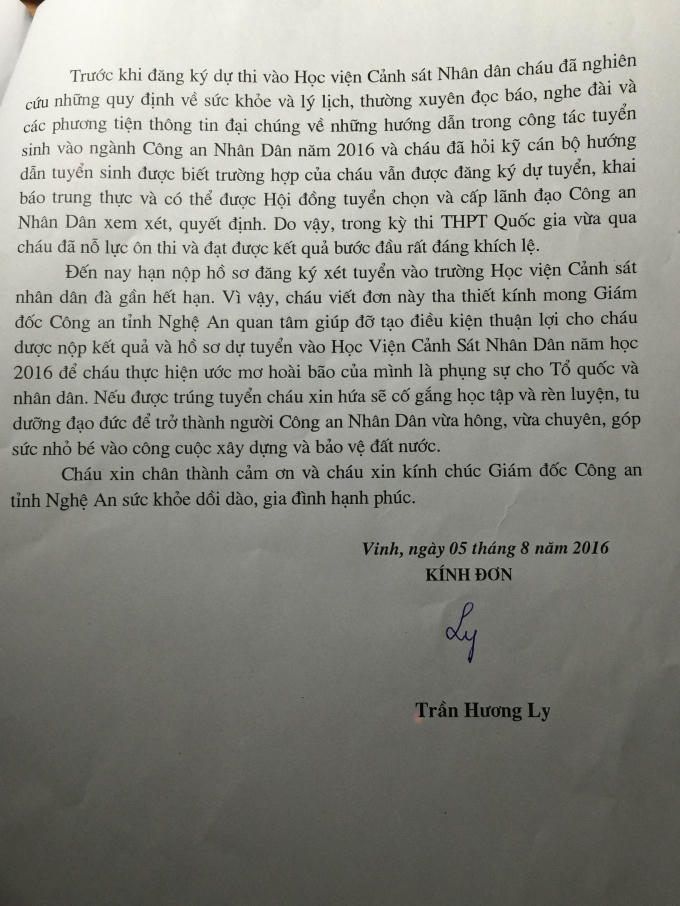Dù hiện tại thời gian xét tuyển vào Học viện Cảnh sát nhân dân đã hết nhưng Hương Ly vẫn tha thiết khẩn cầu Giám đốc Công an tỉnh Nghệ An Nguyễn Hữu Cầu tạo điều kiện giúp đỡ em để em có thể nộp hồ sơ và thực hiện ước mơ của mình.