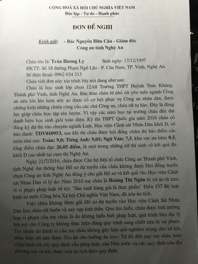 Thí sinh Trần Thị Hương Ly (SN 1997, học sinh lớp 12A8, trường THPT Huỳnh Thúc Khánh, Nghệ An) đã viết đơn đề nghị gửi lãnh đạo Tổng cục Chính trị Công an nhân dân, Giám đốc Học viện Cảnh sát nhân dân, Giám đốc Công an tỉnh Nghệ An về trường hợp của bản thân khi bị từ chối nạp hồ sơ, kết quả vào trường Cảnh sát nhân dân. Vì lý do trước đó mẹ của em từng bị xử án tù treo vì vi phạm pháp luật.